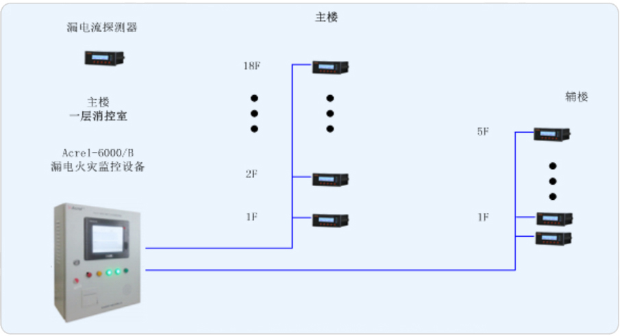 針對本項目的性質(zhì)及配電結(jié)構(gòu),現(xiàn)針對其主樓(18層)、輔樓(5層),兩棟樓設計一套電氣火災監(jiān)控系統(tǒng)。在主樓和輔樓的樓層配電箱的進線端安裝漏電流探測器,由此來實時監(jiān)測變電所內(nèi)重要回路的漏電流,以確保變電所配電系統(tǒng)的電氣安全。