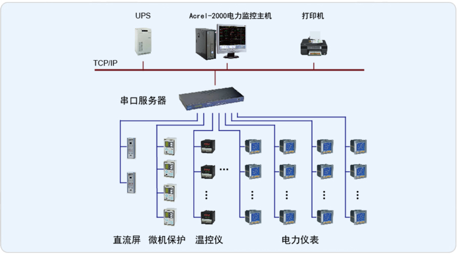 安科瑞對(duì)項(xiàng)目中10kV重要配電回路的多功能電表以及直流屏、溫控儀、光伏縱差保護(hù)裝置、小電流接地選線裝置等,采用現(xiàn)場(chǎng)總線組網(wǎng)方式,將采集數(shù)據(jù)傳至Acrel-2000電力監(jiān)控系統(tǒng),通過該系統(tǒng)實(shí)現(xiàn)變電所配電回路的配電監(jiān)測(cè)。