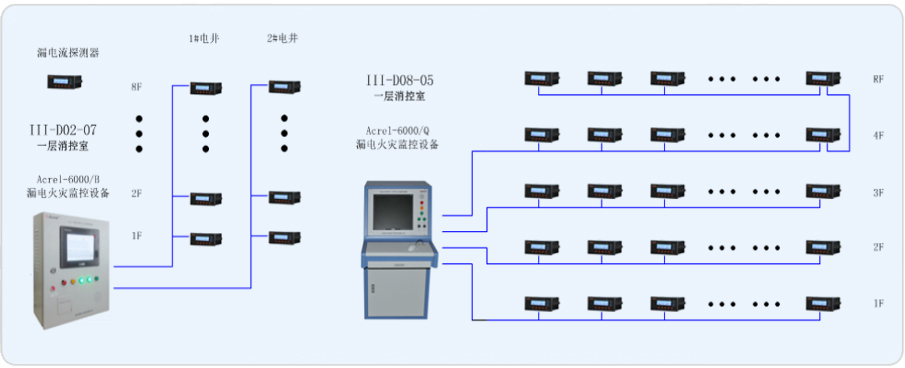 三湘廣場由III-D02-07地塊和III-D08-05地塊各自一獨(dú)棟商業(yè)建筑組成。為了確保本地塊的樓宇的電氣安全,現(xiàn)在樓層內(nèi)的配電箱進(jìn)線端安裝安科瑞品牌ARCM系列漏電流探測器,由此來實(shí)時監(jiān)測變電所內(nèi)重要回路的漏電流,并在III-D02-07地塊和III-D08-05地塊消控室內(nèi)安裝ACREL-6000電氣火災(zāi)監(jiān)控設(shè)備,以確保變電所配電系統(tǒng)的電氣安全。