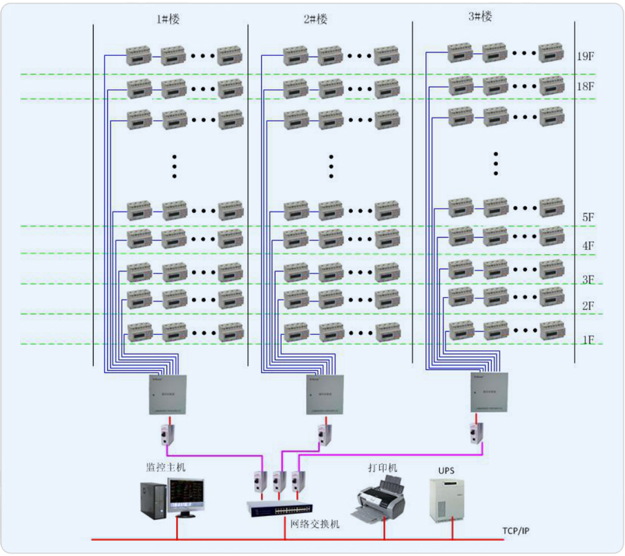 項目對黃金時代大廈各動力箱、照明箱等終端配電箱內(nèi)各用電回路用電量進行電能管理,系統(tǒng)通過多功能的電能計量表計、通訊網(wǎng)絡(luò)和計算機軟件,實現(xiàn)各用電設(shè)備在運行過程中的實時數(shù)據(jù)采集、數(shù)據(jù)計算、數(shù)據(jù)統(tǒng)計、用電分析等,保證復雜供配電系統(tǒng)的安全可靠系數(shù),實現(xiàn)故障快速響應;掌握大廈能源消耗的成本結(jié)構(gòu),確保節(jié)能計劃和措施順利實施;科學、智能管理,提高效率,降低損耗,實現(xiàn)經(jīng)營成本優(yōu)化。系統(tǒng)由站控管理層、網(wǎng)絡(luò)通訊層和現(xiàn)場設(shè)備層構(gòu)成。系統(tǒng)要求盡量減少集中采集數(shù)據(jù)的裝置以保證系統(tǒng)的通訊可靠性。