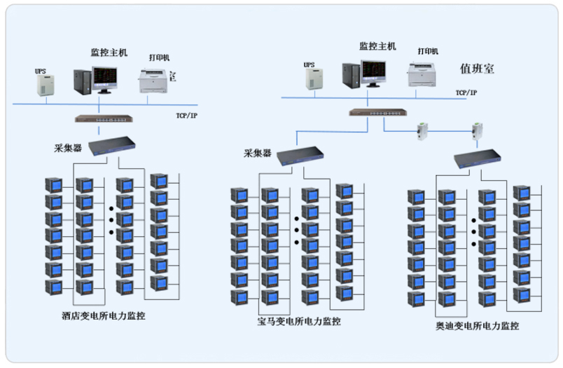 本項目根據(jù)管理區(qū)域設(shè)置兩套Acrel-2000型電力監(jiān)控系統(tǒng),系統(tǒng)采用網(wǎng)絡(luò)分布式結(jié)構(gòu),其中寶馬奧迪主機(jī)設(shè)置在地下配電值班室,酒店設(shè)置在一樓值班室。所有配電回路均配備安科瑞電力儀表PZ系列。該項目實(shí)現(xiàn)了3個變電所內(nèi)電力系統(tǒng)的智能管理。所有監(jiān)控設(shè)備均通過屏蔽雙絞線至各自配電室內(nèi)的通訊管理機(jī),從而實(shí)現(xiàn)遠(yuǎn)程監(jiān)控。