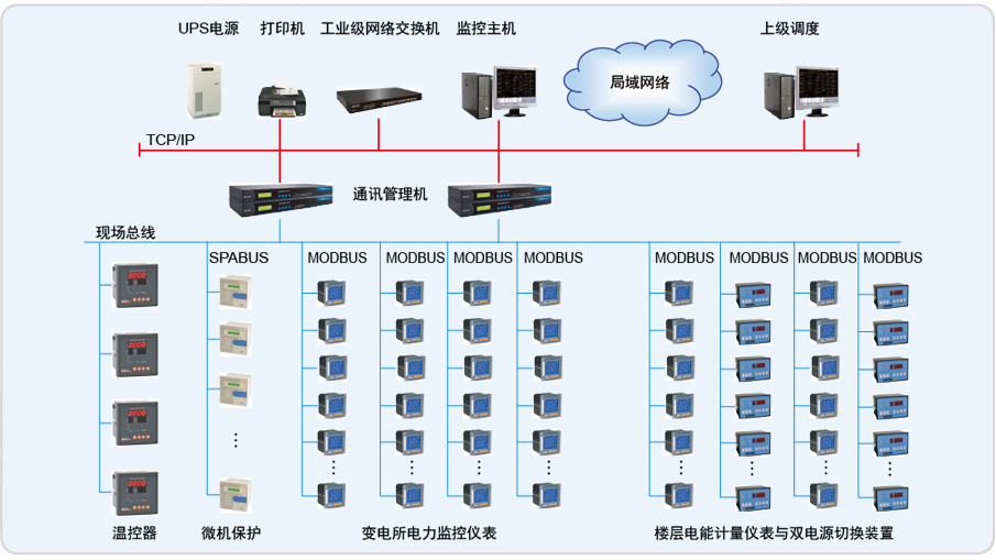 整個(gè)系統(tǒng)采用網(wǎng)絡(luò)分布式結(jié)構(gòu),監(jiān)控主機(jī)位于地下一層變電所值班室內(nèi),各變電所配電柜內(nèi)安裝有本公司ACR230ELH、ACR220EFLK儀表共計(jì)200多回 路。系統(tǒng)采用開放的通訊協(xié)議,通過現(xiàn)場總線與高低壓配電系統(tǒng)、變壓器溫控裝置、發(fā)電機(jī)的智能接口、ATSE及EPS等相連,實(shí)現(xiàn)數(shù)據(jù)通訊功能。同時(shí)監(jiān)視系統(tǒng)提供標(biāo)準(zhǔn)的RS485接口向上連接到BMS系統(tǒng)。